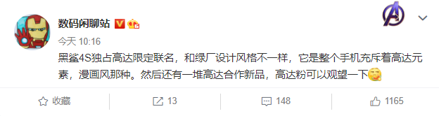 据微博博主 @数码闲聊站 称,黑鲨 4S 独占高达限定联名,和 OPPO 款设计风格不一样,整个手机充斥着高达元素,漫画风那种。然后还有一堆高达合作新品,高达粉可以观望一下。