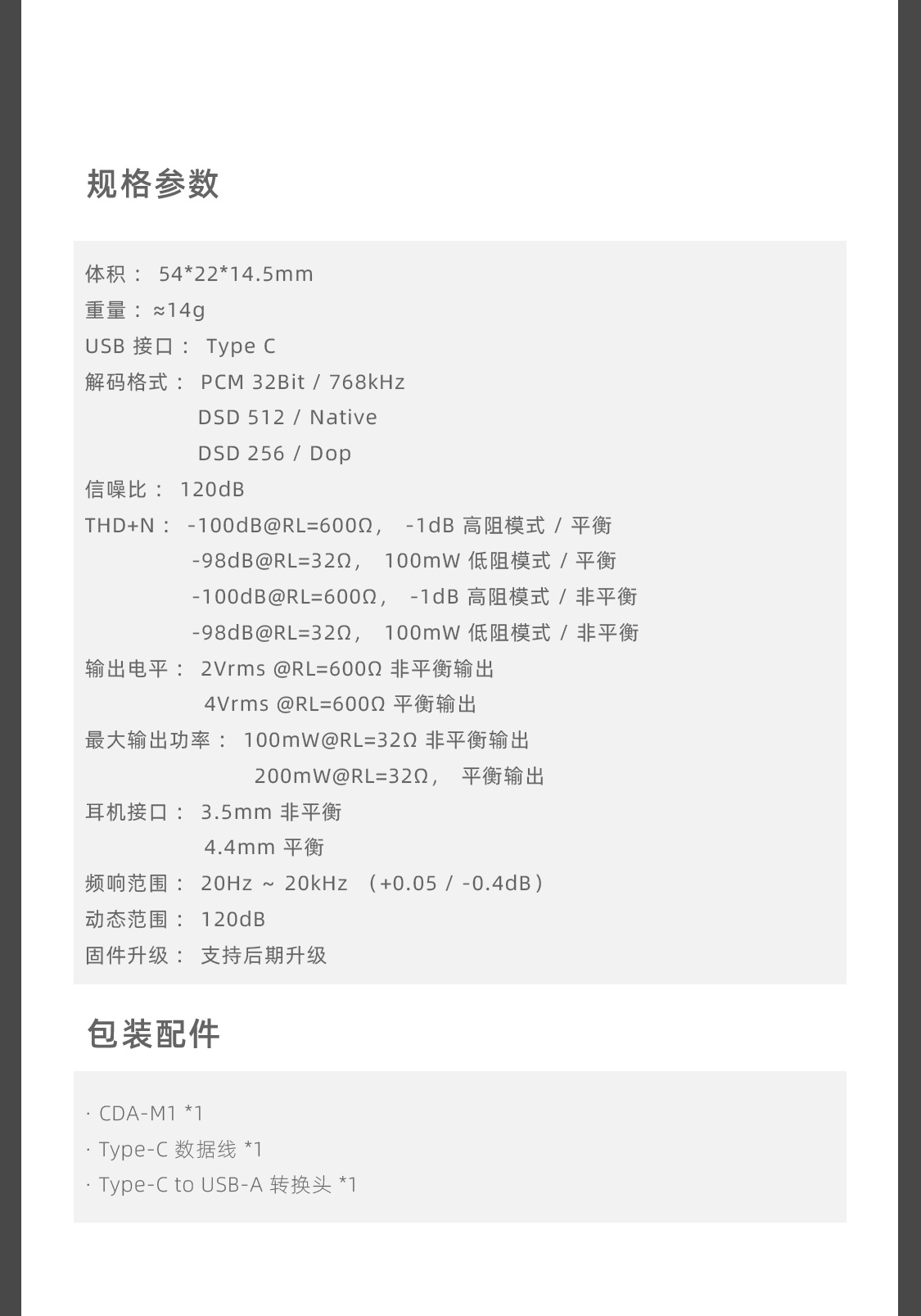 据介绍,Colorfly CDA-M1 是一款兼容多种操作系统的 USB 高音质输出设备,具备前级音量调控功能,采用 USB 供电,搭配 DAC / 数字解码模块 + AMP / 功率放大模块的一体化设计,内置旗舰级播放器 U8 核心音频处理器「α」 ,配备第二代 Jitterkill 技术、超低抖动 100M 有源时钟晶振,数字模拟独立供电,同时具备 4.4mm 平衡与 3.5mm 耳机输出。