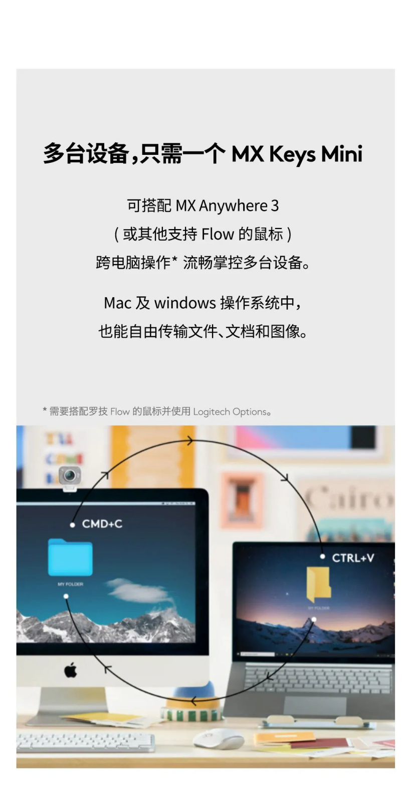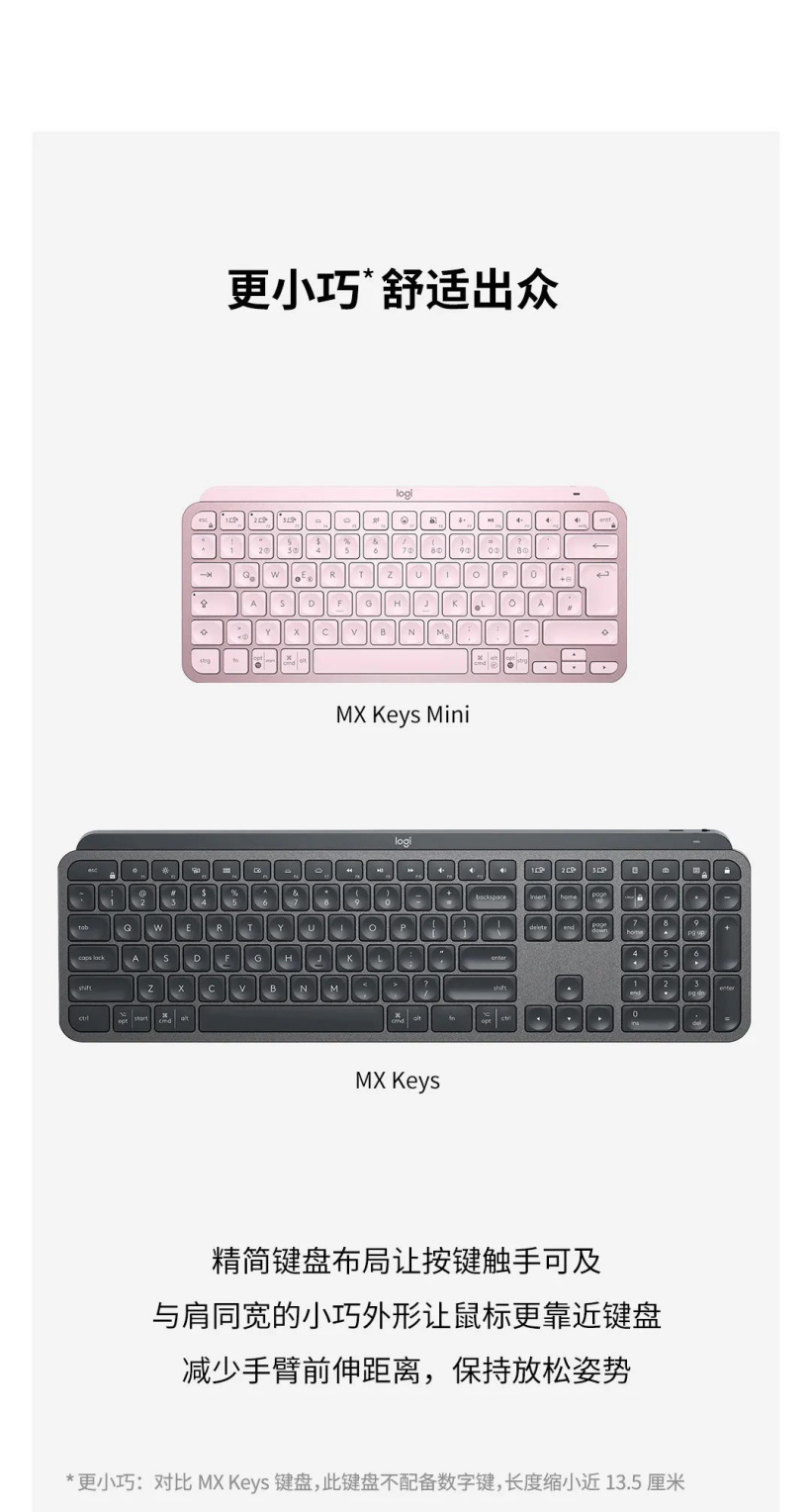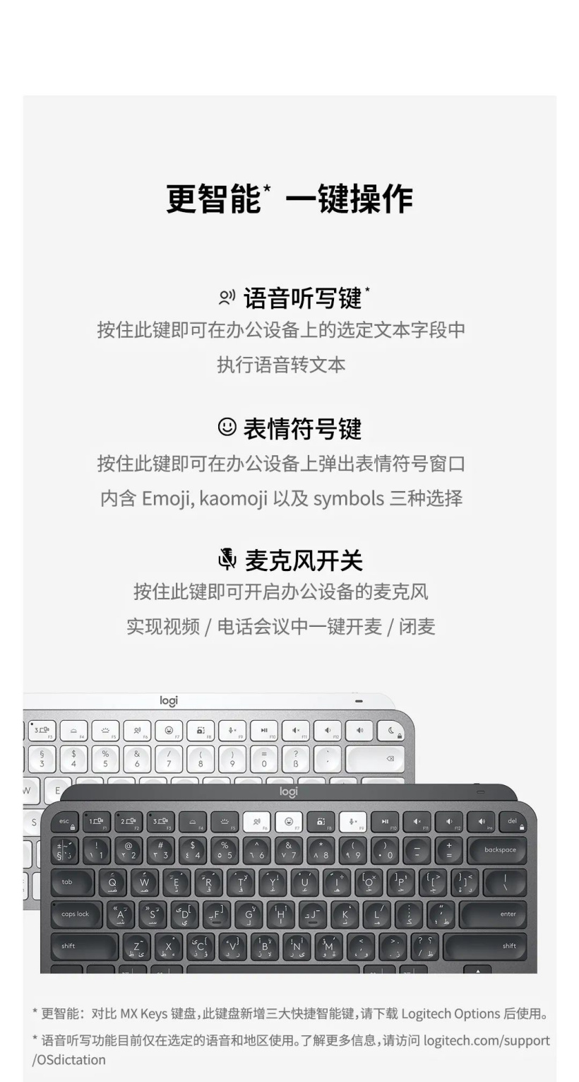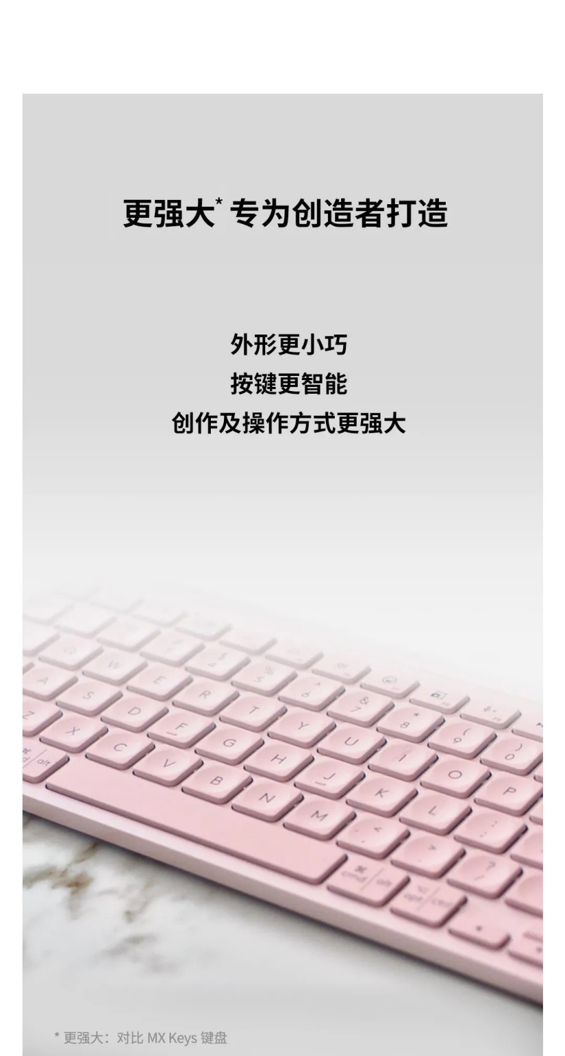 这款键盘相比 MX Keys 取消了数字小键盘和编辑键,面积压缩 40%,而且提供了方向键、语音听写键、麦克风静音键、Emoji 表情符号键,整体的设计则是几乎如出一辙。