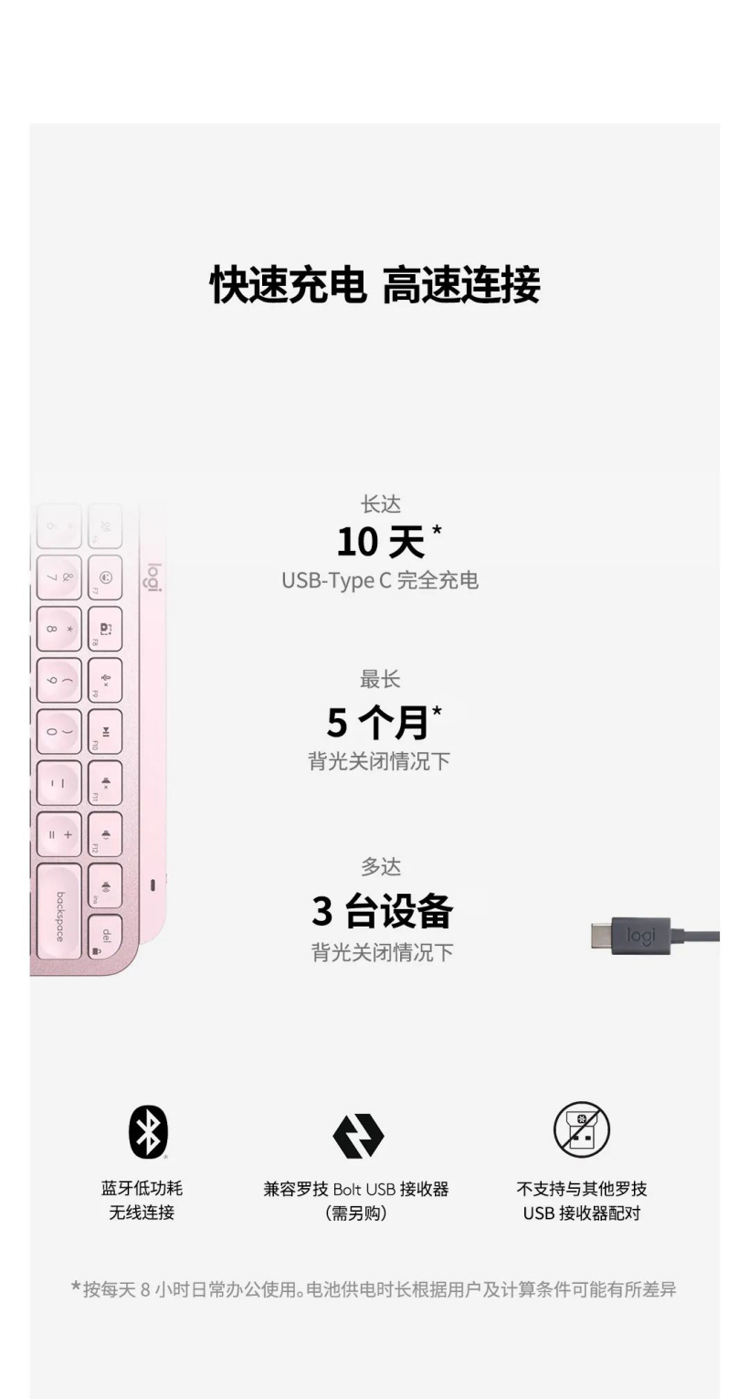 了解到,这款键盘支持 Android、ChromeOS、Linux、iOS 和 iPadOS 等多个平台使用,并且可以使用蓝牙或 USB 接收器配对最多三个设备,采用 USB-C 接口,并且支持快充,在开启省电模式之后,续航可达 5 个月。