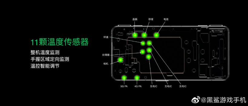 此外,该机内置 11 颗温度传感器,整机全局温度监测,手握区域定向监测,实时调节智能散热,为手机高效降温。