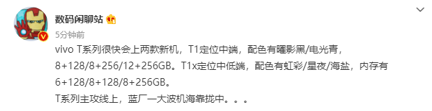 该博主还称,vivo T 系列主攻线上,vivo 还将发布一大波新机。