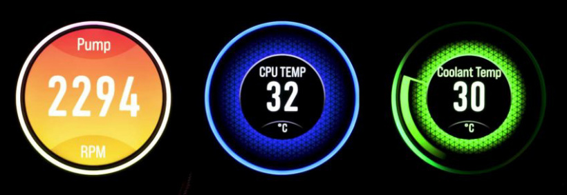 这款散热器的水冷头造型简洁,水管有着编织网进行保护;LCD 屏幕能够以动画形实时显示 CPU 表面、水冷液温度,以及水泵转速。水冷排配备定制的 RGB 风扇,可以分区显示多彩光效。