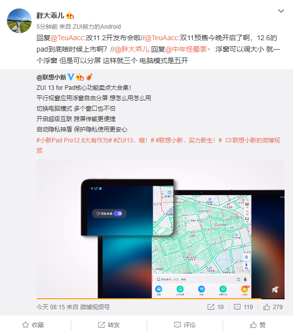 除此之外,联想届时还将推出 ZUI 13 for Pad 系统,联想 ZUI 13 系统拥有全新的桌面天气小部件,超级互联功能支持与手机相连,互相投屏。此外,平板还可以连接电脑进行投屏,在电脑上操作手机应用,共享剪切板。
