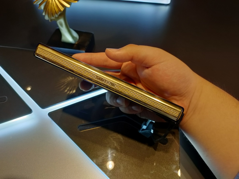 机身侧面,心系天下三星 W22 5G 的铰链外壳,采用高端腕表 PCD 金属精密切割工艺,经由纳米级抛光研磨的雕琢,让多切面圆形珍珠纹路在折叠的一开一合之间,在光影交错的变幻之中,更显考究的工艺价值。