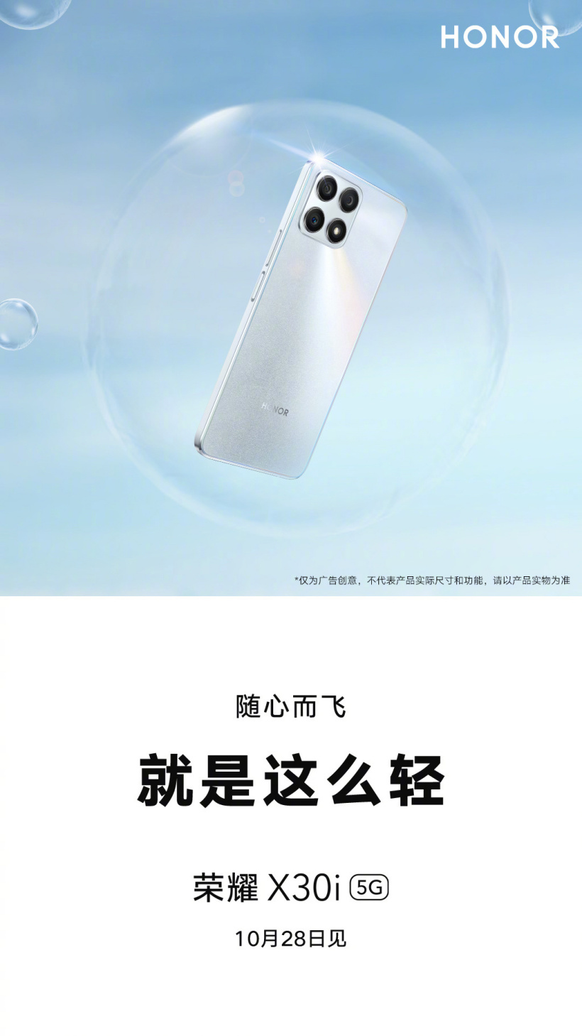 10 月 26 日消息,荣耀昨日发布了 Play 5 活力版,今日开始为即将到来的荣耀 X30i 预热。官方表示,荣耀 X30i 5G 主打轻薄手感。