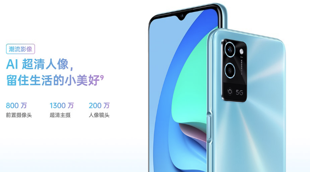 这款机型搭载了联发科天玑 700 5G 芯片,辅以 LPDDR4X 内存和 UFS 2.2 闪存,提供 5GB 内存扩展,支持存储卡扩展,采用 6.5 英寸 1600×720 LCD 水滴屏,60Hz 刷新率,120Hz 触控采样率。