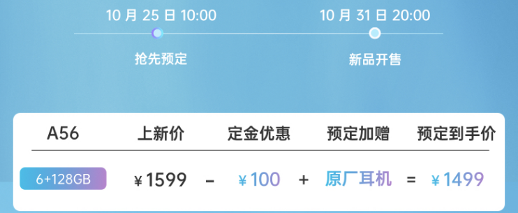 10 月 26 日消息,OPPO 现推出了一款 A 系列新机 ——OPPO A56,目前已在京东商城等平台上架,6+128GB 版本 1599 元,首发 1499 元,10 月 31 日晚 20:00 开售。