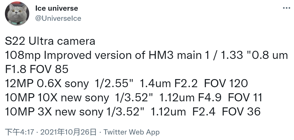 10 月 27 日消息,根据 Twitter 用户 @UniverseIce 的消息表示,目前已经确定了三星 Galaxy S22 Ultra 后置摄像头的具体参数信息。