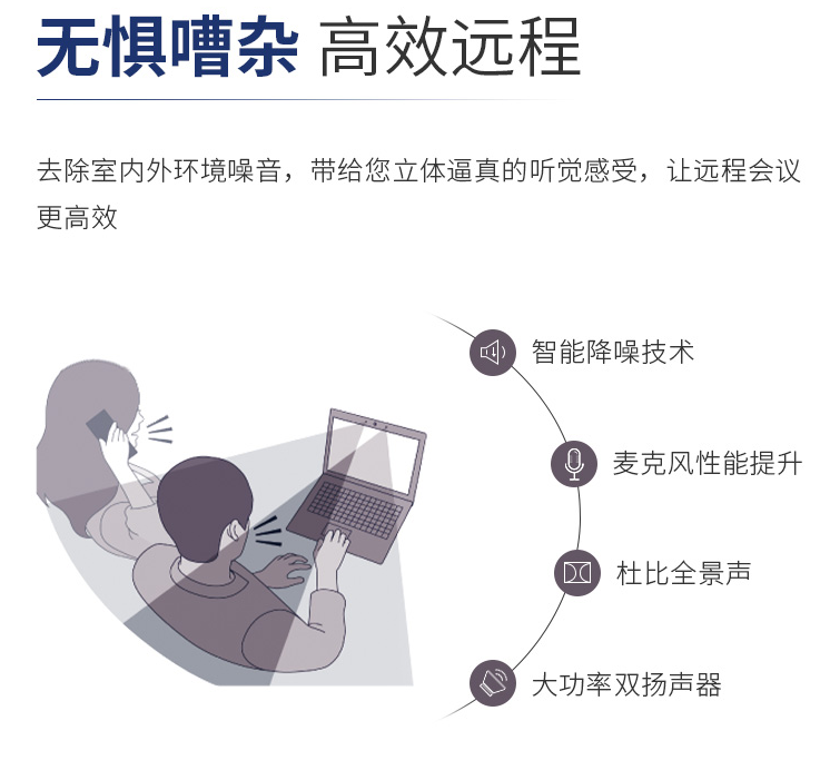 这款笔记本搭载高质量麦克风,支持 AI 降噪功能。还配备大功率双扬声器,支持杜比全景声技术。
