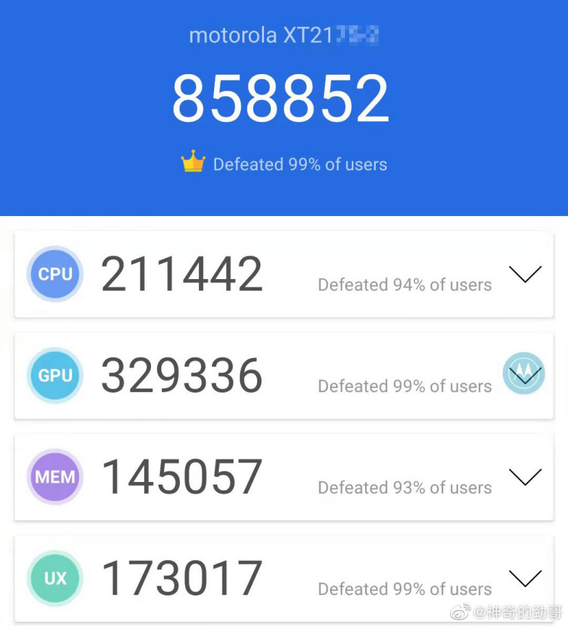 目这位产品经理在微博的小尾巴,已经改为不知名的摩托罗拉手机,预计为即将发布的新品。今日公布的跑分数据显示,新款 edge s 安兔兔综合跑分达 85.8 万分,手机代号“motorola XT21...”其中 CPU 分数为 211441 分,GPU 部分 329336 分,性能释放十分完全。