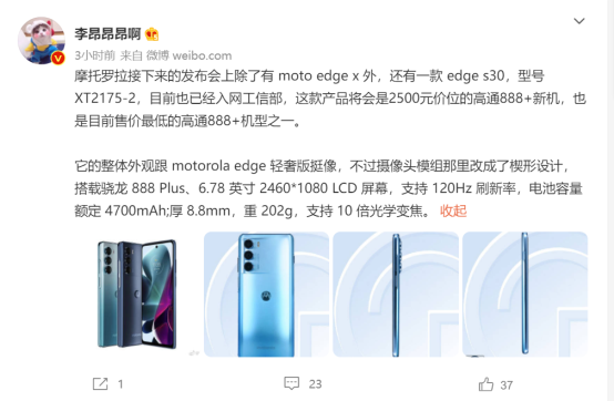 由数码博主@李昂昂昂啊 带来相关信息,称“摩托罗拉接下来还有一款edge s30,型号为XT2175-2,目前也已经入网工信部,这款产品将会是2500元价位的高通888+新机,也是目前售价最低的高通888+机型之一。”