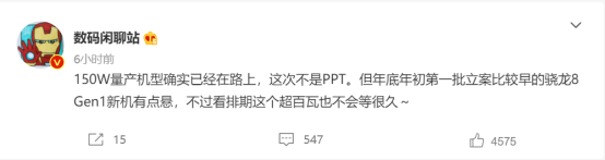 ITBEAR科技资讯11月18日消息,小米方面近两年在快充上有着异于平常的努力,例如打破世界纪录的200W有线快充与120W无线快充,看来这项技术即将被运用在新旗舰手机上。据知名数码博主@数码闲聊站 带来消息,称“150W量产机型已经在路上了”。