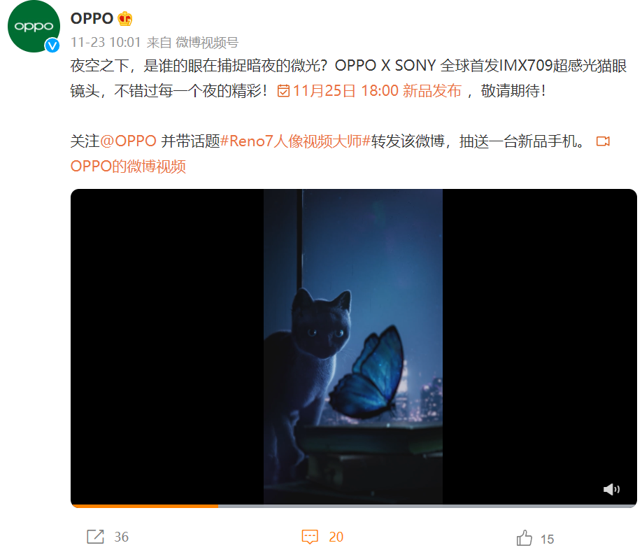 11 月 23 日消息,今日上午,OPPO 官方公布了 Reno7 系列的最新预热视频,称将全球首发 IMX709 超感光猫眼镜头。