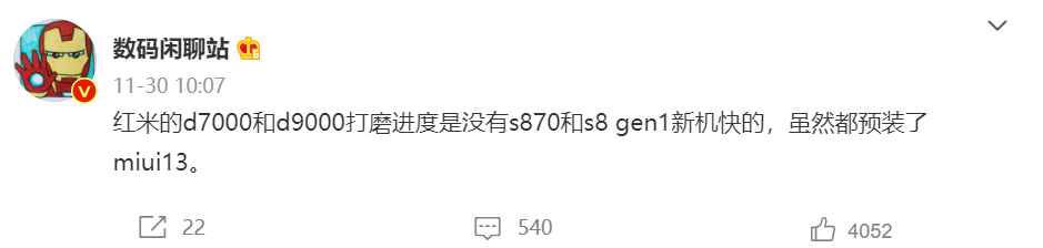 11 月 30 日,博主 @数码闲聊站 曾表示,Redmi 的天玑 7000 和天玑 9000 打磨进度没有骁龙 870 和骁龙 8 Gen1 新机快,虽然都预装了 MIUI 13。