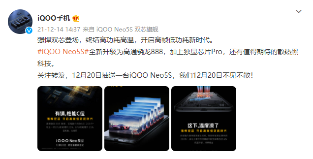12 月 14 日消息,iQOO 官方在今日上午宣布,将在 12 月 20 日正式发布 iQOO Neo5S 手机,带来进化的“双芯”系统。
