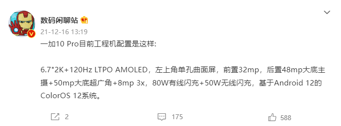 今日微博博主 @数码闲聊站 曝光了一加 10 Pro 的部分参数,表示手机将配备 6.7 英寸 2K.120Hz LTPO 材质 AMOLED 屏。