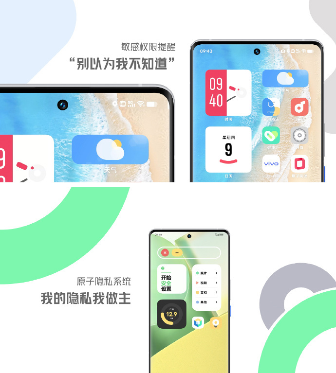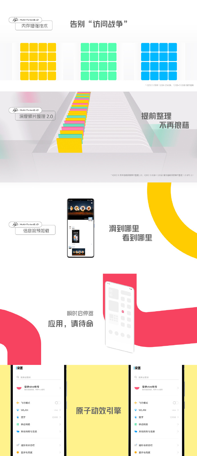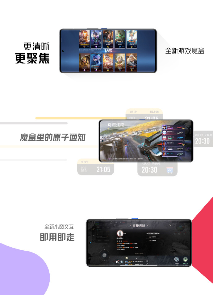 iQOO 9 搭载全新系统,原子通知、原子组件、小窗等,从小细节带来大便捷,游戏魔盒全新升级,沉浸游戏,重要信息不遗漏。内存增强技术、深度碎片整理 2.0、信息流预加载,确保畅快体验;敏感权限,了解应用敏感权限使用状况;原子隐私系统,确保隐私安全。