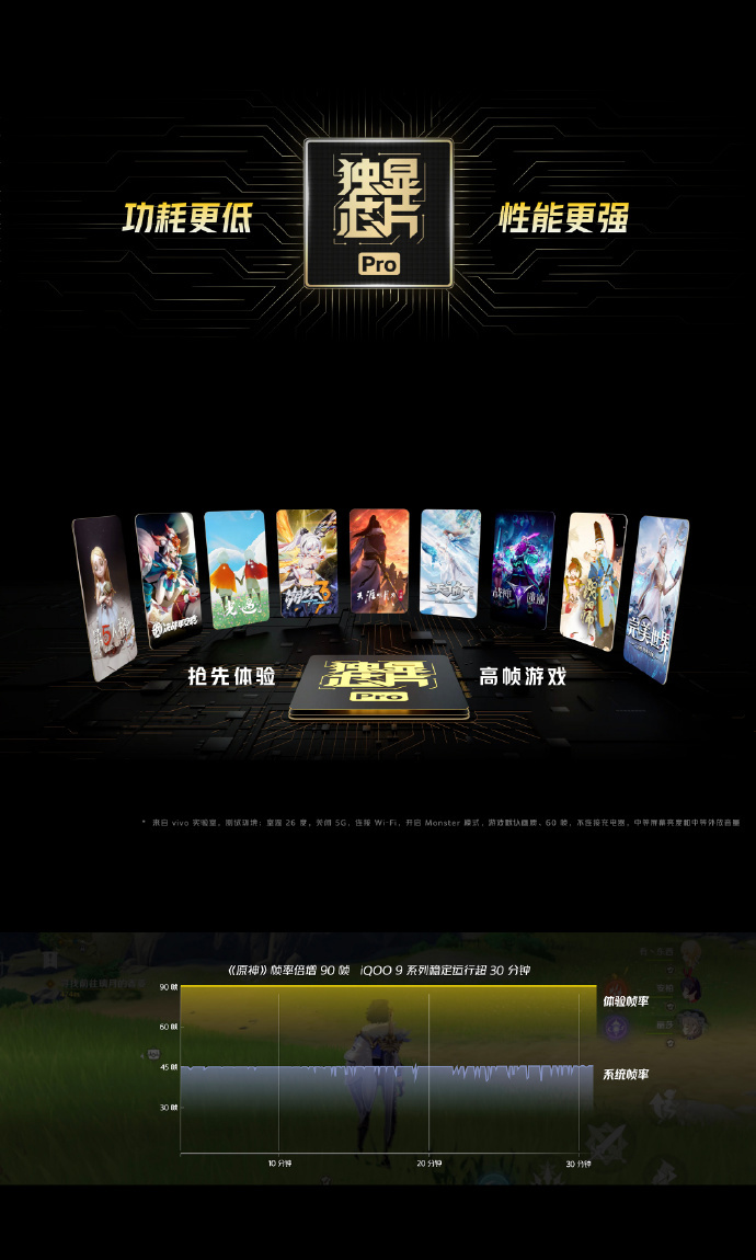 iQOO 9 系列首批搭载全新一代骁龙 8 移动平台,还搭载了独立显示芯片 Pro,带来高帧低功耗的游戏畅爽体验。通过游戏插帧,率先体验 90 帧甚至 120 帧内容,此外还有降功耗、稳帧率的效果,持久高帧游戏,表现依旧稳定。高帧游戏现已支持多款热门游戏。