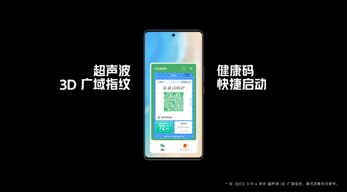 iQOO 9 Pro 手机采用超声波 3D 广域指纹,只需 1 次录入,日常指纹解锁快至 0.2 秒。指纹解锁面积更大的同时,可以实现健康码快捷启动,为生活带来更多便捷。