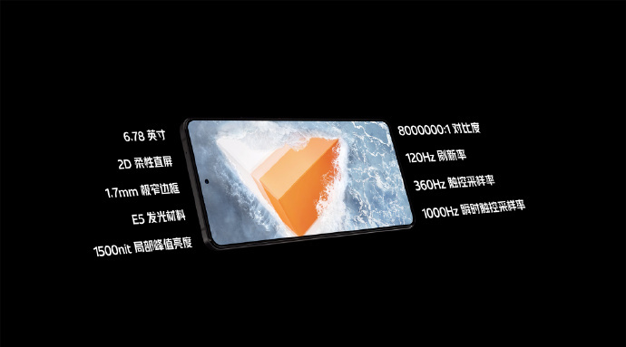 iQOO 9 手机升级至 6.78 英寸的三星 120Hz E5 柔性直屏,1.7mm 极窄边框,视觉体验再次进化,直屏操控,游戏体验更佳。局部峰值亮度可达 1500nit,强光环境下,屏幕内容依然清晰可见。