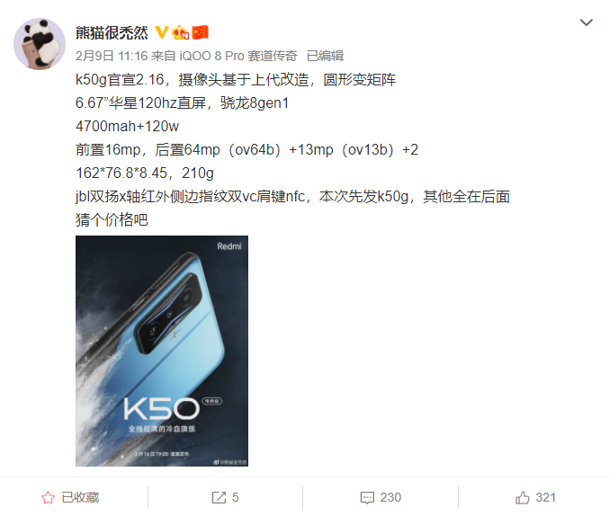 经过了很长一段时间的爆料和官方预热,近日全新的 Redmi K50 系列正式得到官宣,不过最先亮相的仅有一款机型 ——K50 电竞版。作为 Redmi 在 2022 年的开年大作和专为 K 系列用户打造的硬核 Dream Phone,该机将采用全新工艺,全新架构,性能大升级,并挑战“最冷骁龙 8”,释放极限性能。现在有最新消息,近日有数码博主进一步晒出了该机的更多配置细节。
