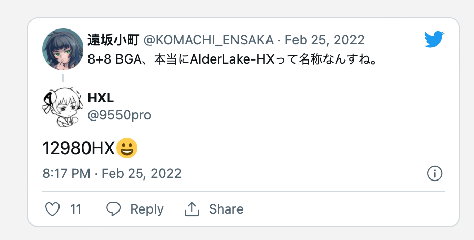 两名靠谱消息人士称,这款 Alder Lake-HX 处理器可能是会命名为 i9-12980HX,8 大核 + 8 小核,BGA 封装。当前,英特尔 Alder Lake-H 的最高型号为 i9-12900HK,这也为 HX 系列的命名留出了空间。