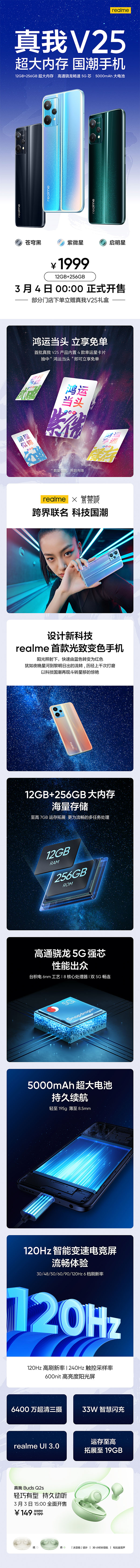 真我V25官方售价1999元(12GB+256GB),真我V25将于3月4日0点进行线上线下全渠道发售,感兴趣的朋友可以关注一下。