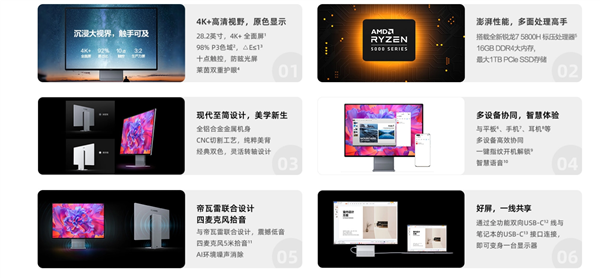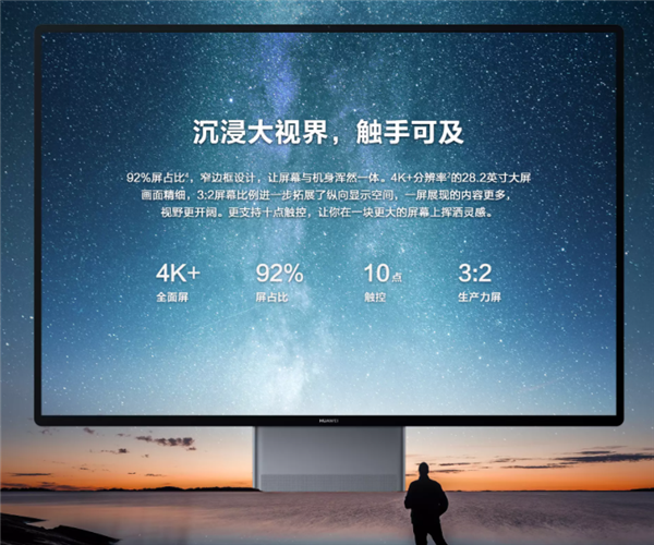 屏幕配备28.2英寸超大屏幕,分辨率为3840x2560,3:2比例的生产力屏,实现了92%的超高屏幕比例,同一尺寸下显示可以多显示8%的内容,更适合文字阅读、视频渲染等生产力工作。