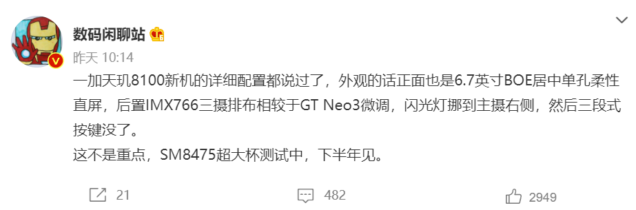 据数码博主@数码闲聊站爆,这款新机采用6.7英寸BOE居中单孔柔性直屏,后置IMX766三摄,取消了三段式按键,支持150W闪充,15分钟可充满4500mAh。