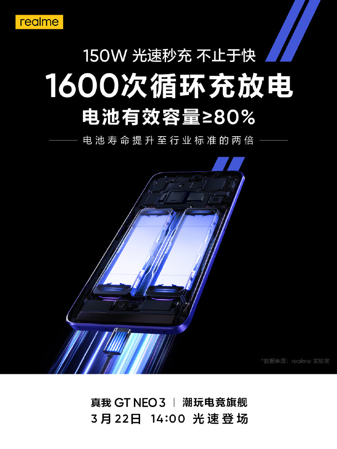 ITBEAR科技资讯3月17日消息:realme今天官方,新机真我GTNeo3将全球首发150W光速秒充,这是当前最快的手机快充技术。