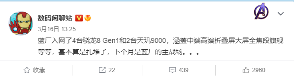 近期 vivo 有大量新机入网或曝光,@数码闲聊站 称,vivo 近日入网了 4 台骁龙 8 Gen1 旗舰和 2 台天玑 9000 旗舰,涵盖中端高端折叠屏大屏全焦段旗舰,他认为会在下个月集中发布。
