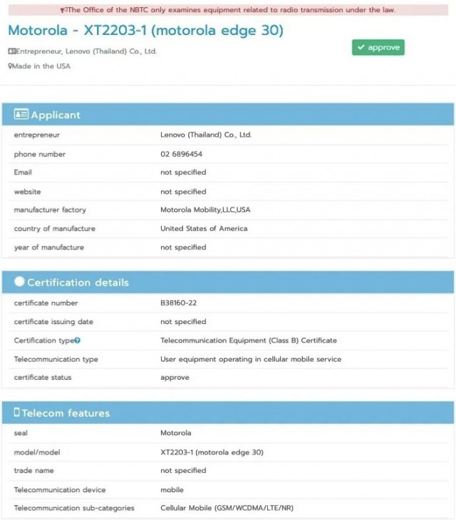 摩托罗拉 Edge 30 手机在泰国 NBTC 的网站上列出,型号为 XT2203-1,但是该泰国认证机构没有透露其具体规格。