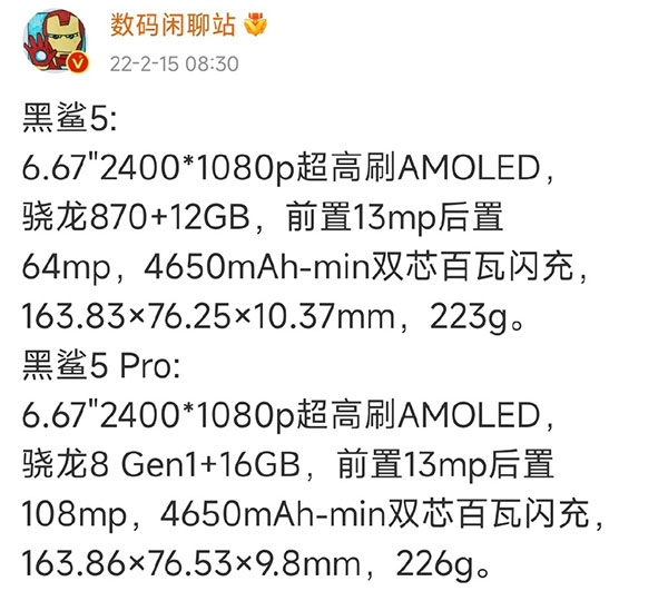 根据爆料,黑鲨5系列手机有黑鲨5、黑鲨5Pro和黑鲨5RS三款机型,均配备4650mAh电池并支持120W快充。