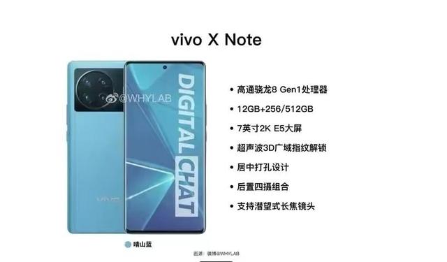 根据此前爆料,vivo X Note 定位大屏商务旗舰,搭载骁龙 8 Gen1 处理器,配备7.0英寸2K大屏,内置5000mAh大容量电池,支持80W有线快充和50W无线快充,采用超声波指纹解锁方案,将与vivo X Fold 折叠屏一同在4月11日的vivo新品发布会上亮相。