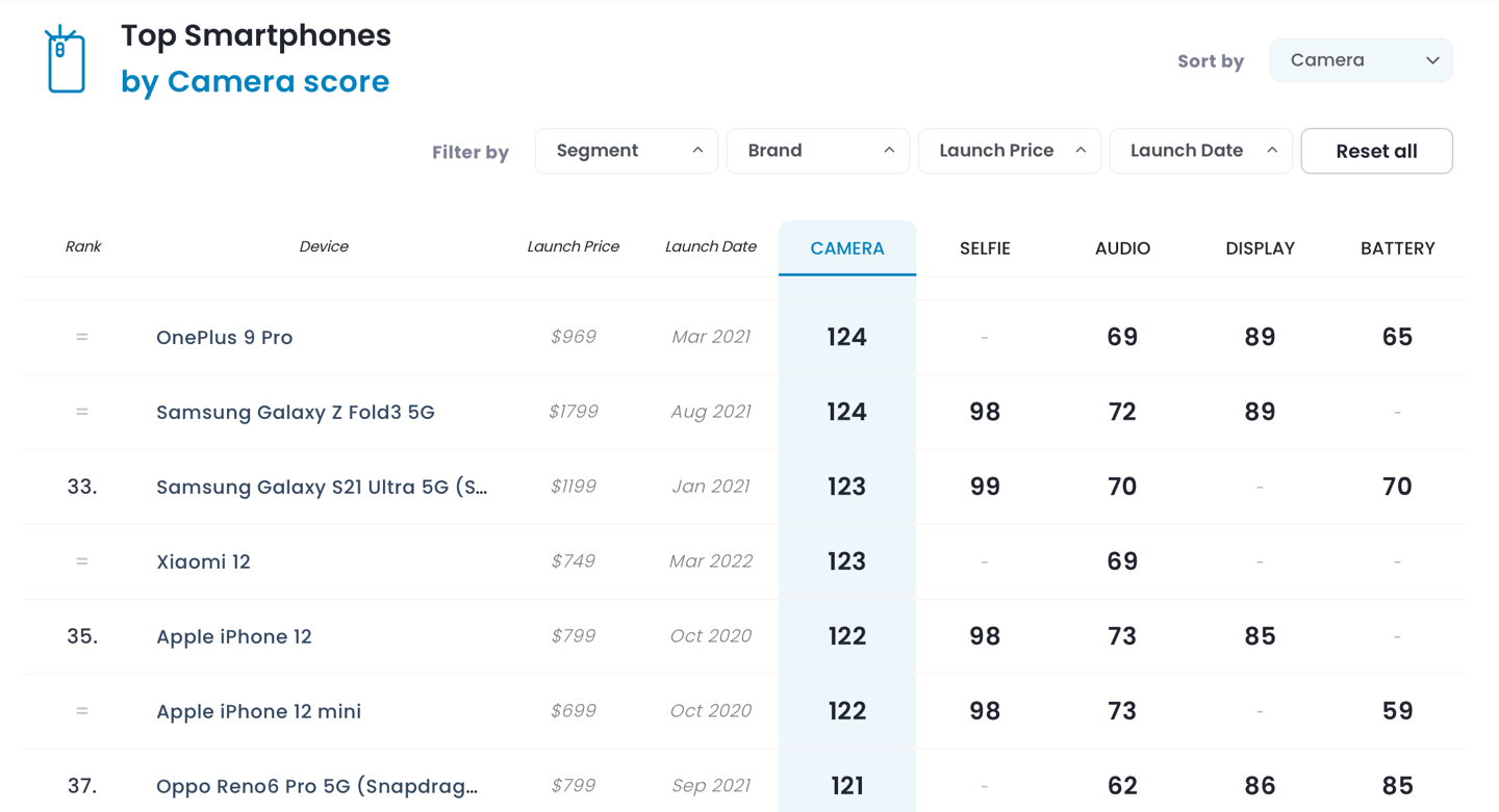 小米 12 相机评分位列 DXOMARK 高端机型排行榜第 5 名,在总排行榜中排名第 33 名,与三星 S21 Ultra 5G 相同,比 iPhone 12 高一分。