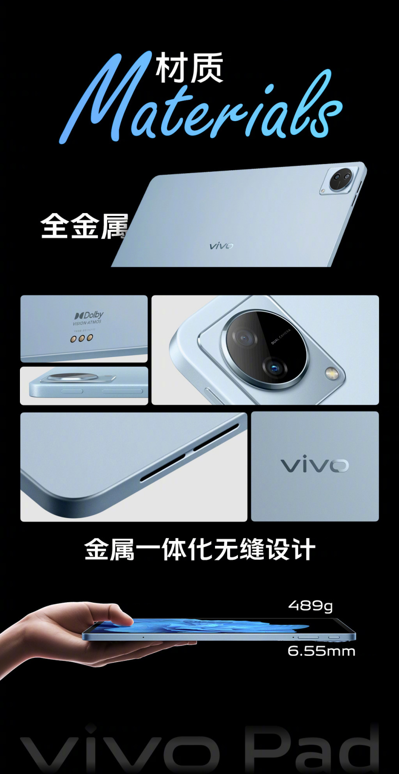 设计方面,vivo Pad 由一整块航空铝合金铸造,搭配 CNC 精雕工艺,自主研发「屏下隐藏式天线」,机身 0 天线接缝,机身薄至 6.55mm,重量仅 489g。
