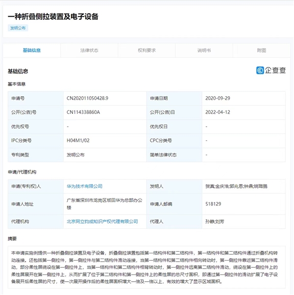 ITBEAR科技资讯4月12日消息,华为技术有限公司公开了“折叠侧拉装置及电子设备”专利,公开号为CN114338860A。