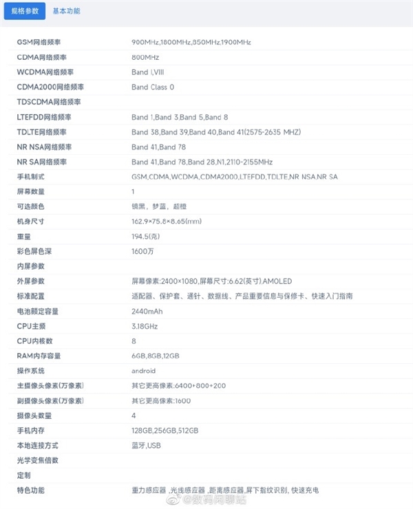 该机低配版则是1300万+200万后置双摄,电池为额定4880mAh,厚度为8.1mm,重190g。