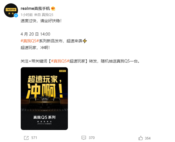 ITBEAR科技资讯4月12日消息,realme官方今日宣布,将在4月20日14:00正式发布realmeQ5系列,并在海报上打出了“超速玩家,冲啊!”的口号。