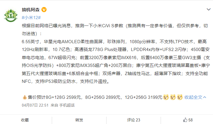 小米Civi S参数曝光,有望本月发布