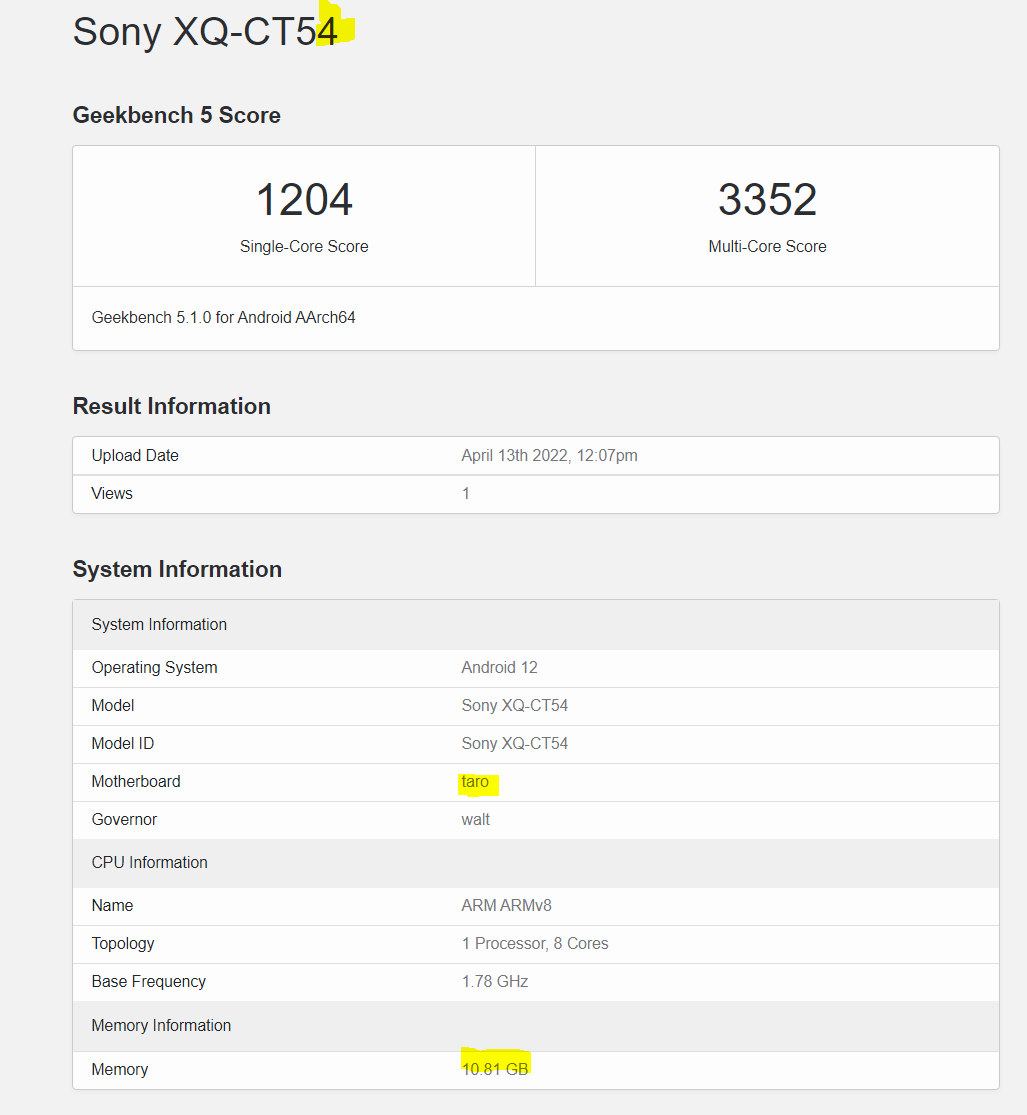 根据列表显示,这款手机型号为 XQ-CT54,搭载代号为“taro”的芯片,这是高通骁龙 8 Gen1 的代号。早些时候有传言称,这款手机可能搭载骁龙 8 Gen1 Plus 处理器,但现在看来事实并非如此。