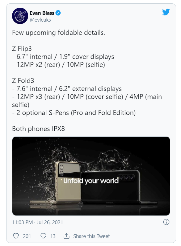7 月 27 日消息 此前有消息称,三星即将发布的 Galaxy Z Flip/Fold 3 将支持 IPX8 级防尘防水,这对于折叠屏手机来说确实有点黑科技。