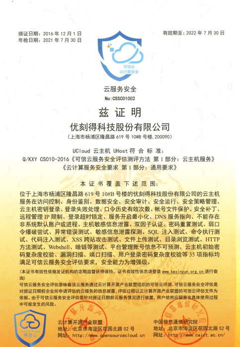 UCloud 优刻得云主机(UHost)通过该项认证标志着,在网络访问控制、信息访问控制、资源访问控制、统一身份鉴别、账户临时授权、访问权限管理、特权访问管理、凭据安全、用户自主密钥管理、敏感数据保护、剩余信息保护、管理控制台操作审计、输入数据验证、运行环境隔离、用户定义安全策略、第三方安全产品支持、策略固定等方向已全面具备可信云服务安全标准管理能力。