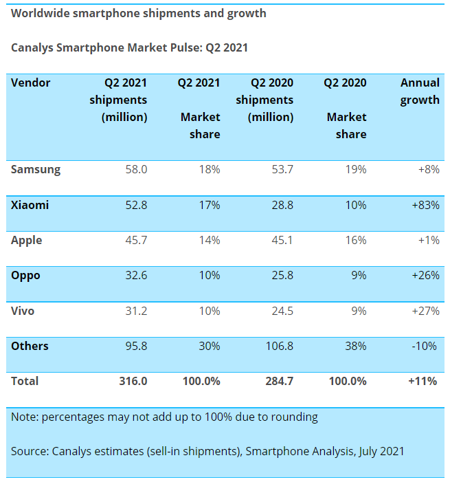 Canalys:2021Q2 全球智能手机出货 3.16 亿部,三星第一小米第二