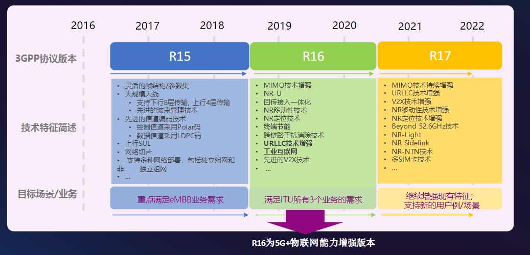 相较 5G R15 标准版本,R16 做了很多增强:支持 1 微秒同步精度、1 毫秒空口时延、可靠性达到 99.999%、灵活的终端组管理,最快可实现 5 毫秒以内的端到端时延和更高的可靠性,提供支持工业级时间敏感等。5G R16 完善了 URLLC 和 mMTC 的特性,这些技术特性将加速 5G 在工业、汽车、能源、医疗、公用事业等物联网应用。