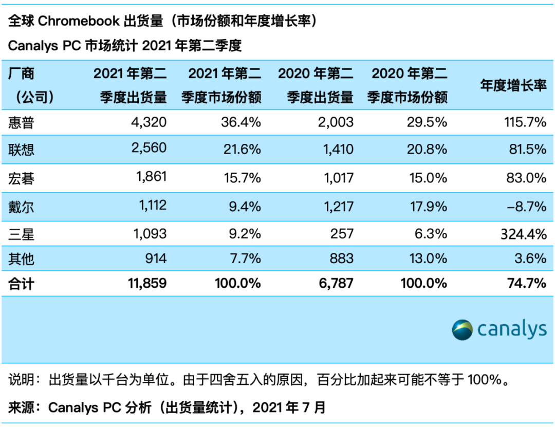 Canalys:Q2 全球 Chromebook 增幅达到 75%,惠普、联想、宏碁前三