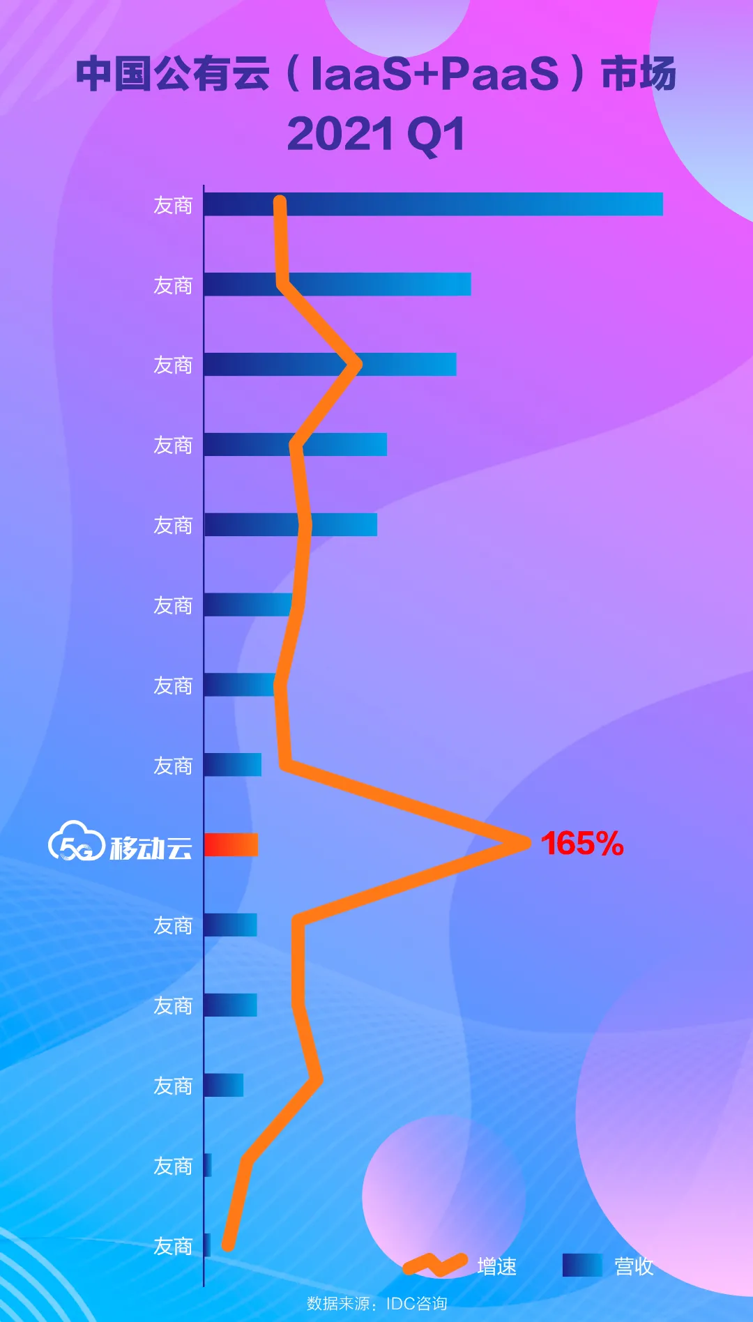 国际权威数据咨询公司IDC最新发布了《中国公有云服务市场(2021第一季度)跟踪》(IaaS+PaaS),移动云再次跑出加速度,Q1同比增速达165%,继续稳居行业第一!移动云的公有云市场份额攀升至第9!