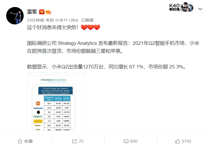 8 月 3 日消息 今天早上,小米 CEO 雷军表示,国际调研公司 Strategy Analytics 发布最新报告:2021 年 Q2 智能手机市场,小米集团在欧洲首次登顶,市场份额超越三星和苹果。数据显示,小米 Q2 出货量 1270 万只,同比增长 67.1%,市场份额 25.3%。