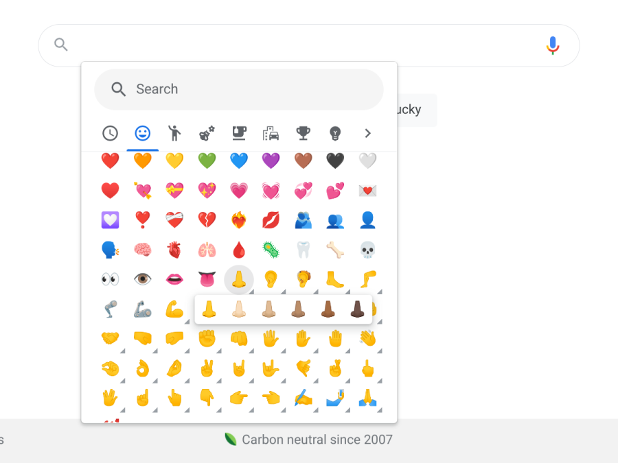 字符显示在密集的网格中,有九个类别(和最近的),让你滚动到该特定的部分。具有多种肤色的表情符号被标注在右下角,点击右键可显示所有可用的选项。